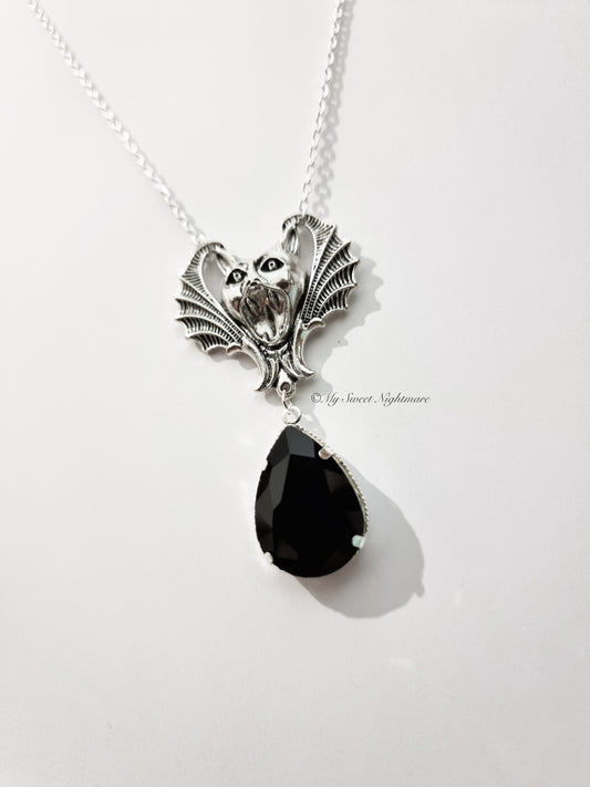 Collana gotica con pipistrello e cristallo nero a goccia