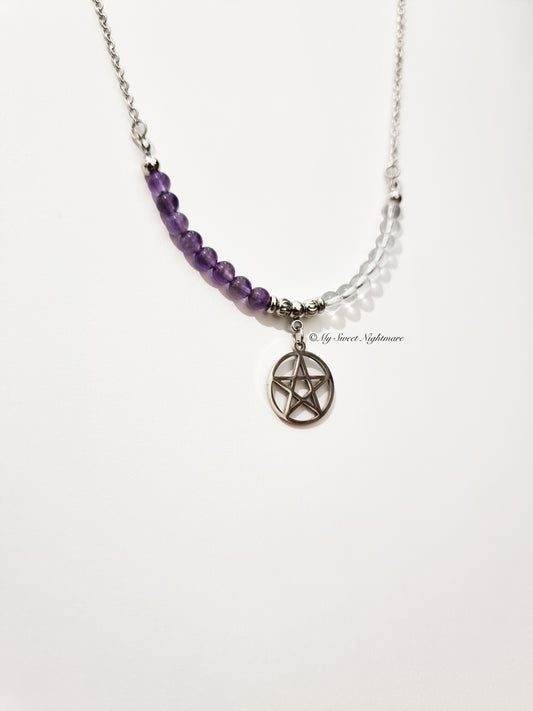 Necklace with pentagram, amethyst and rock crystal