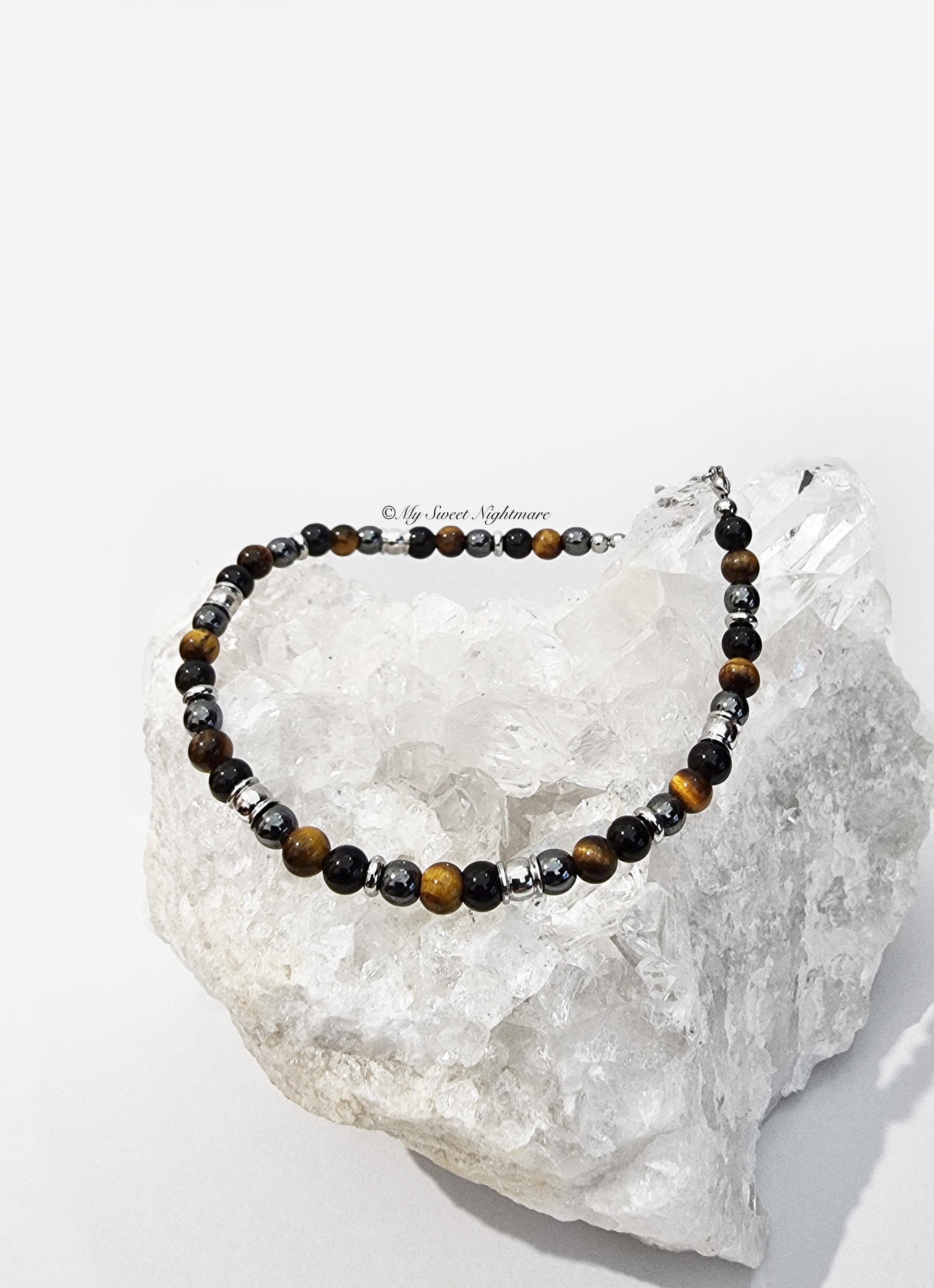 - Bracelet material: Tiger's eye, hematite, obsidian, steel