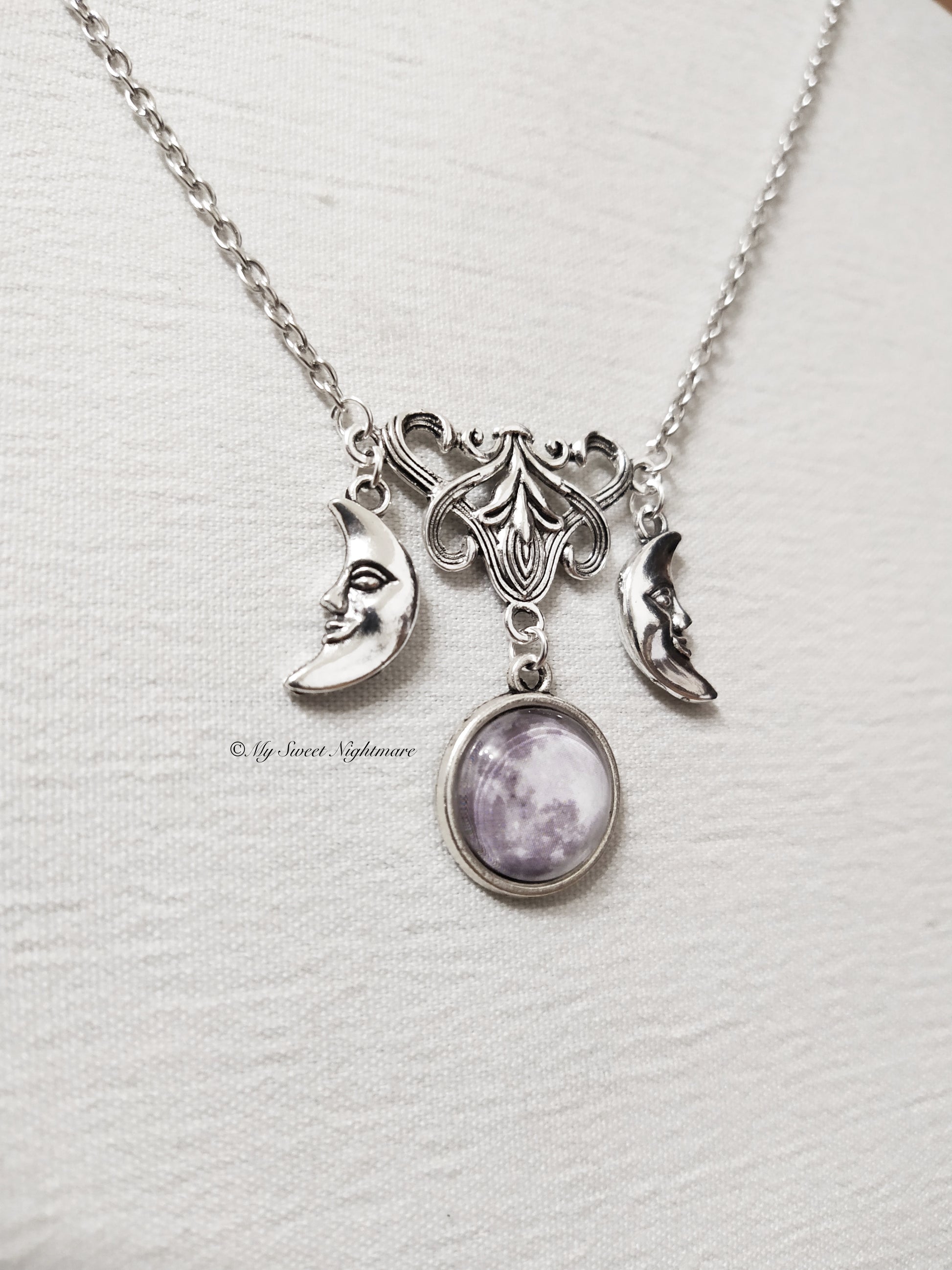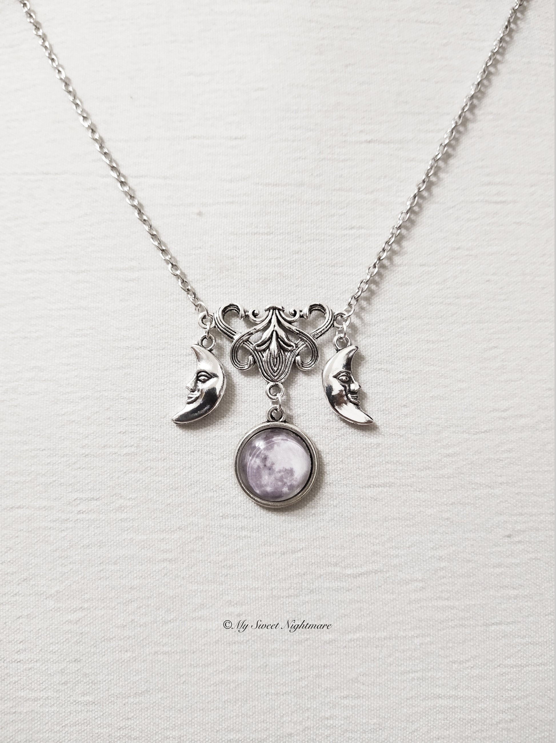This jewel symbolizes the triple moon and represents the phases of female growth, the waxing moon on the left represents the young girl, the full moon in the center represents the mother, the waning moon on the right represents the old woman.
