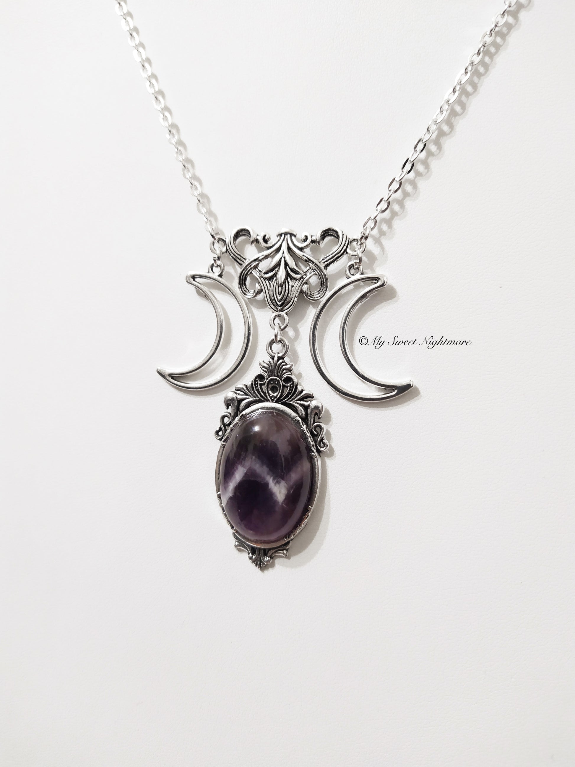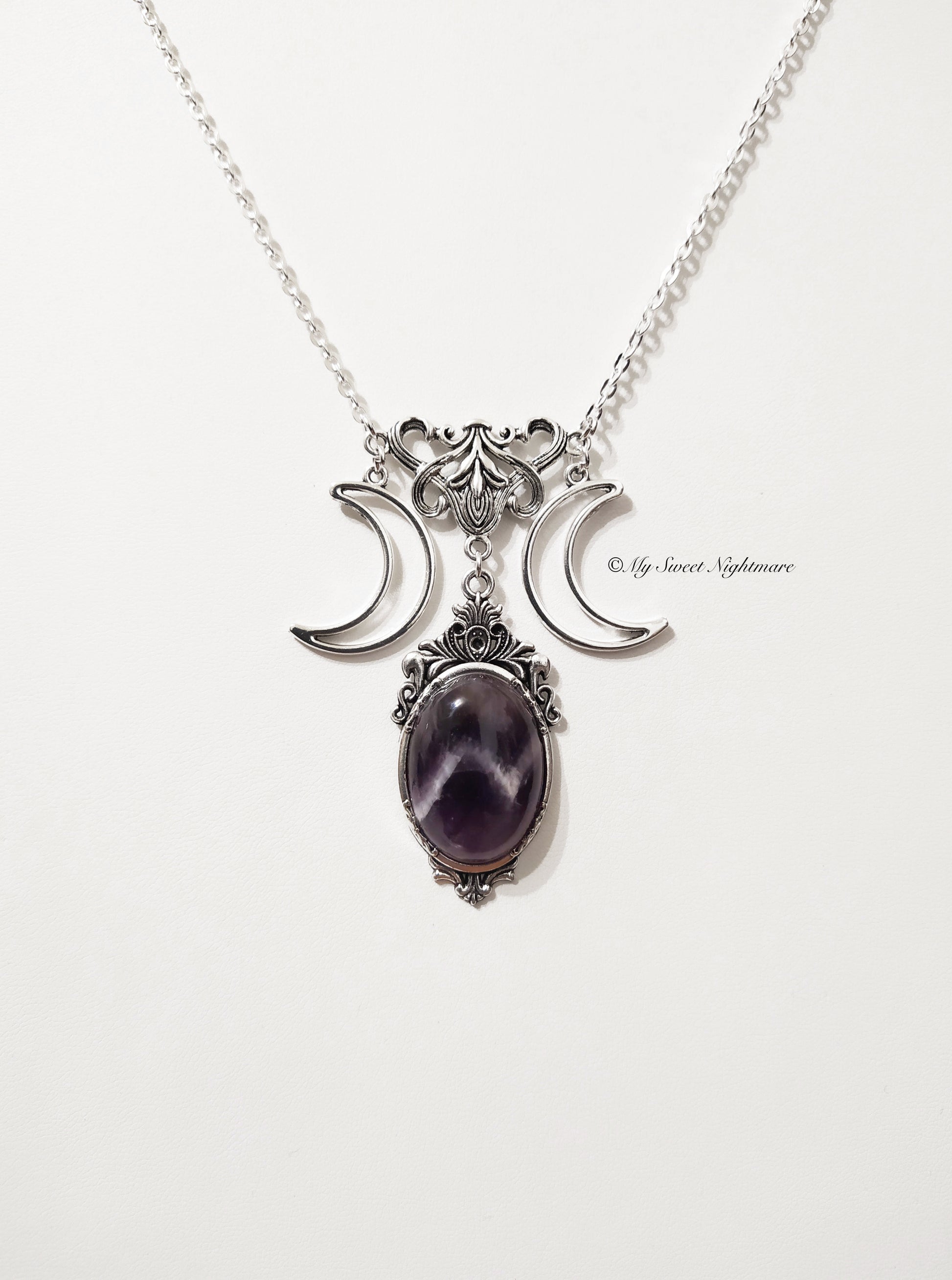 The cabochon of this triple moon encloses a splendid amethyst, this jewel combines the properties of the amethyst and the symbolism of the triple moon, which represents the phases of female growth, the waxing moon on the left represents the girl, the full moon in the center represents the mother, the waning moon on the right represents the old woman.