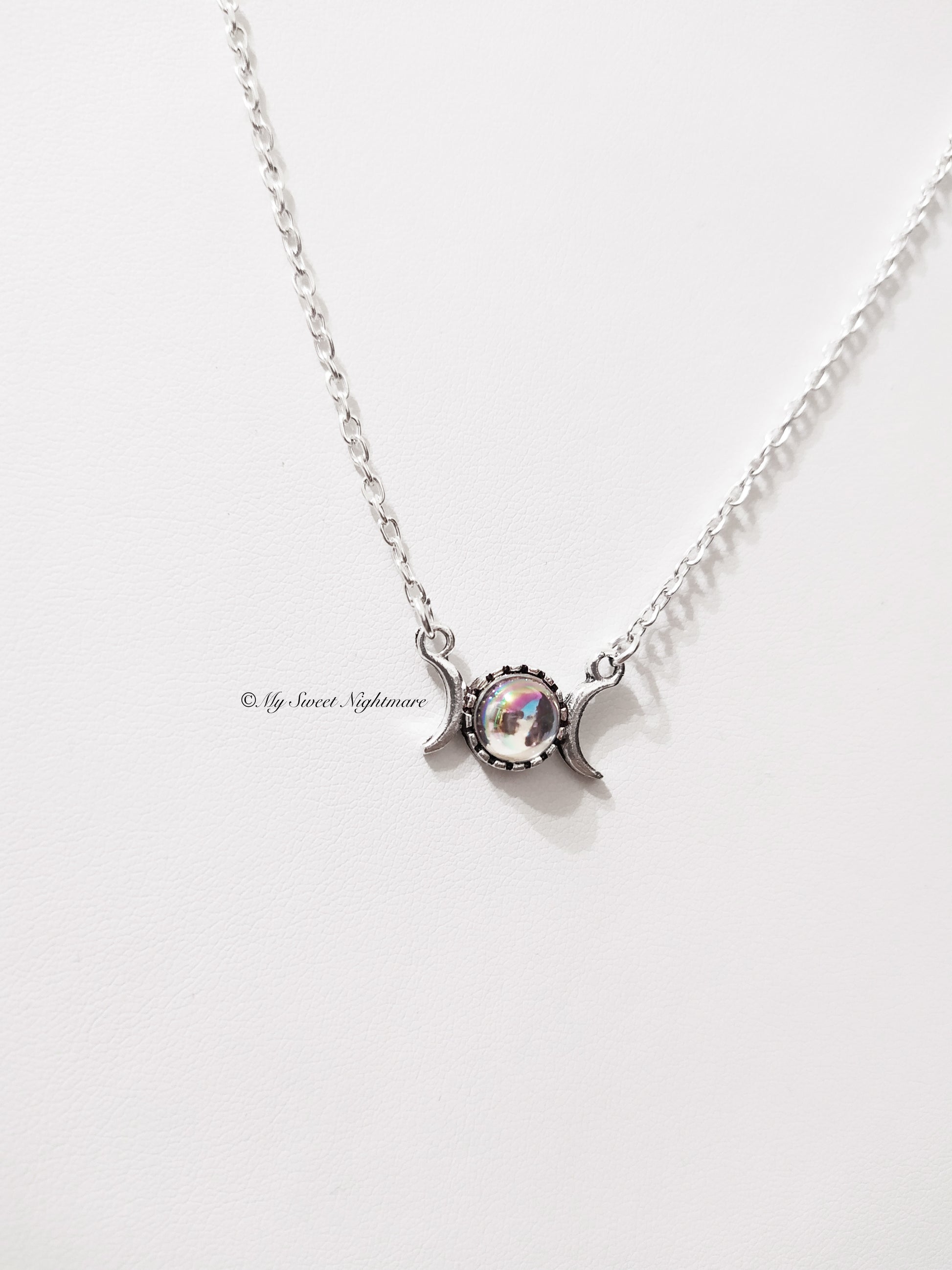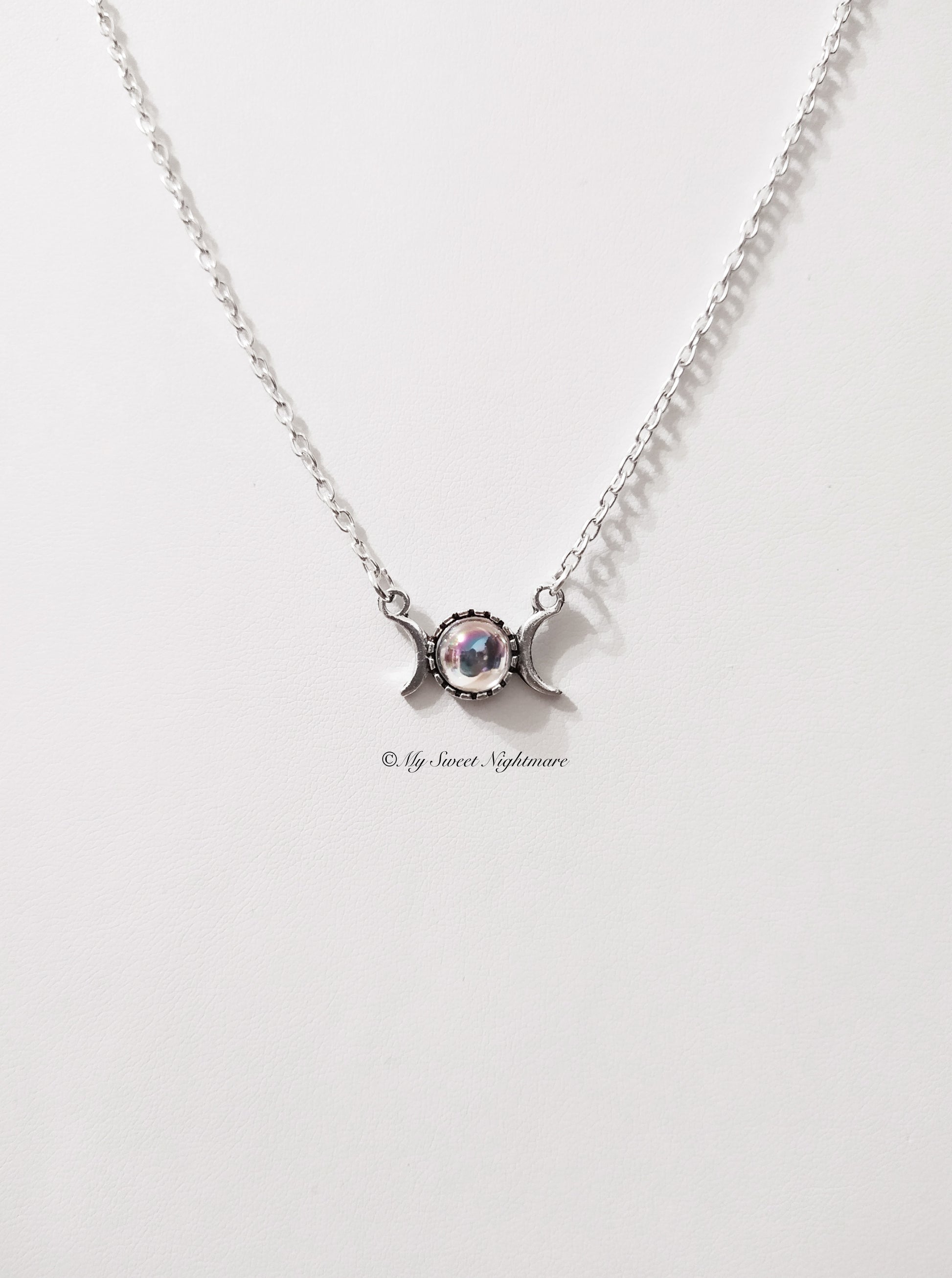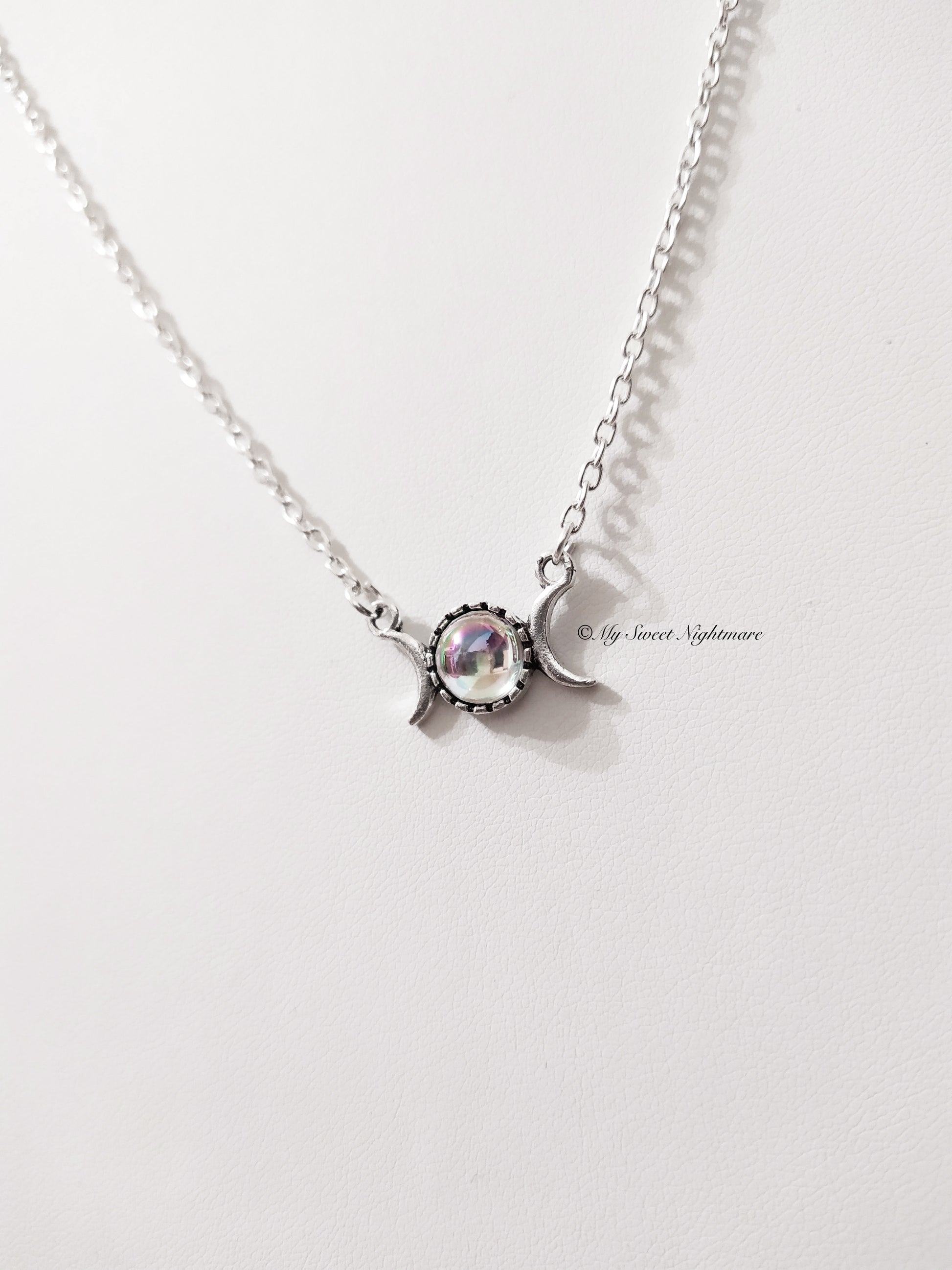 The cabochon of this small triple moon has rainbow reflections, this jewel symbolizes the triple moon which represents the phases of female growth, the waxing moon on the left represents the girl, the full moon in the center represents the mother, the waning moon on the right represents the old woman.