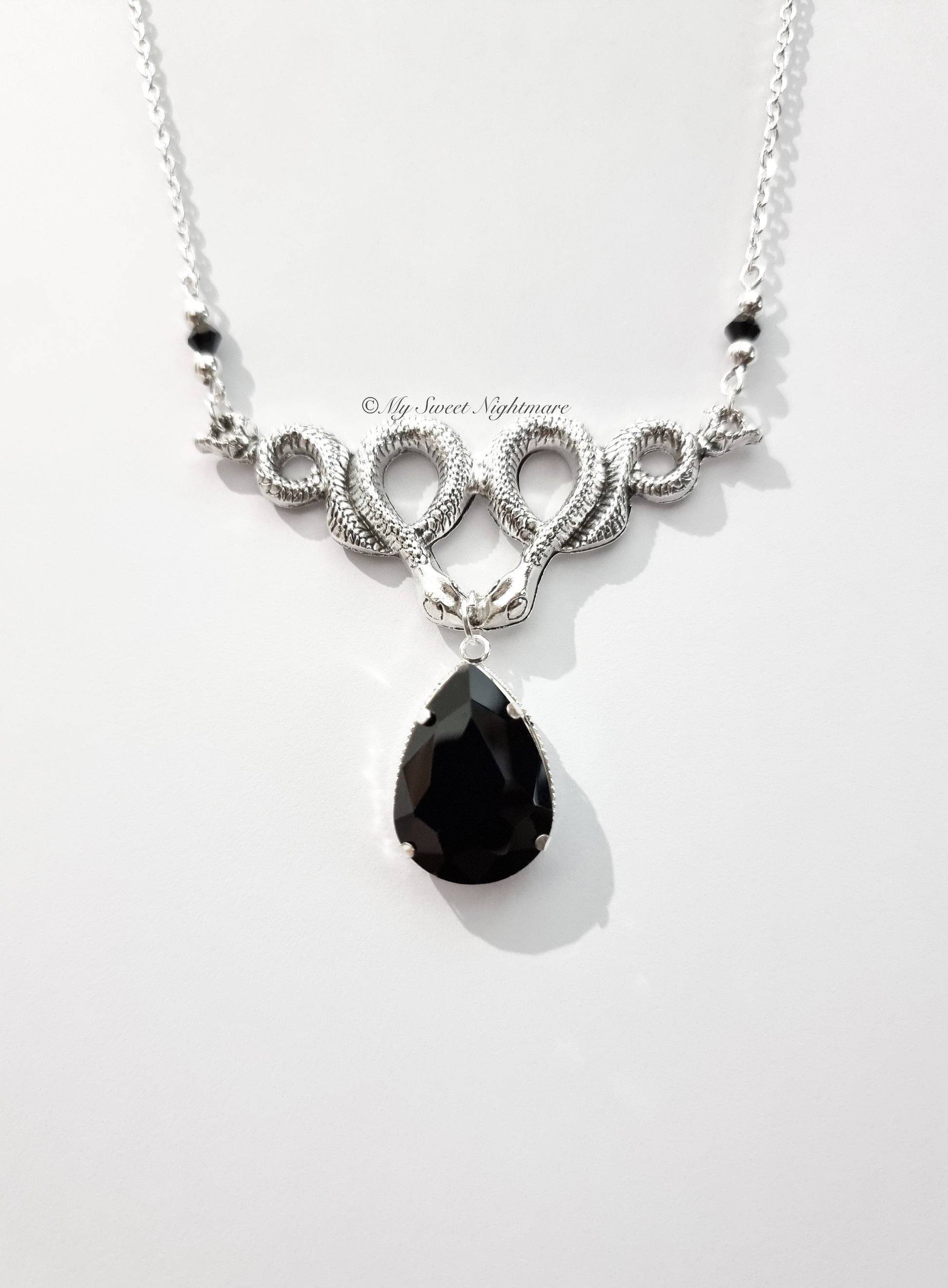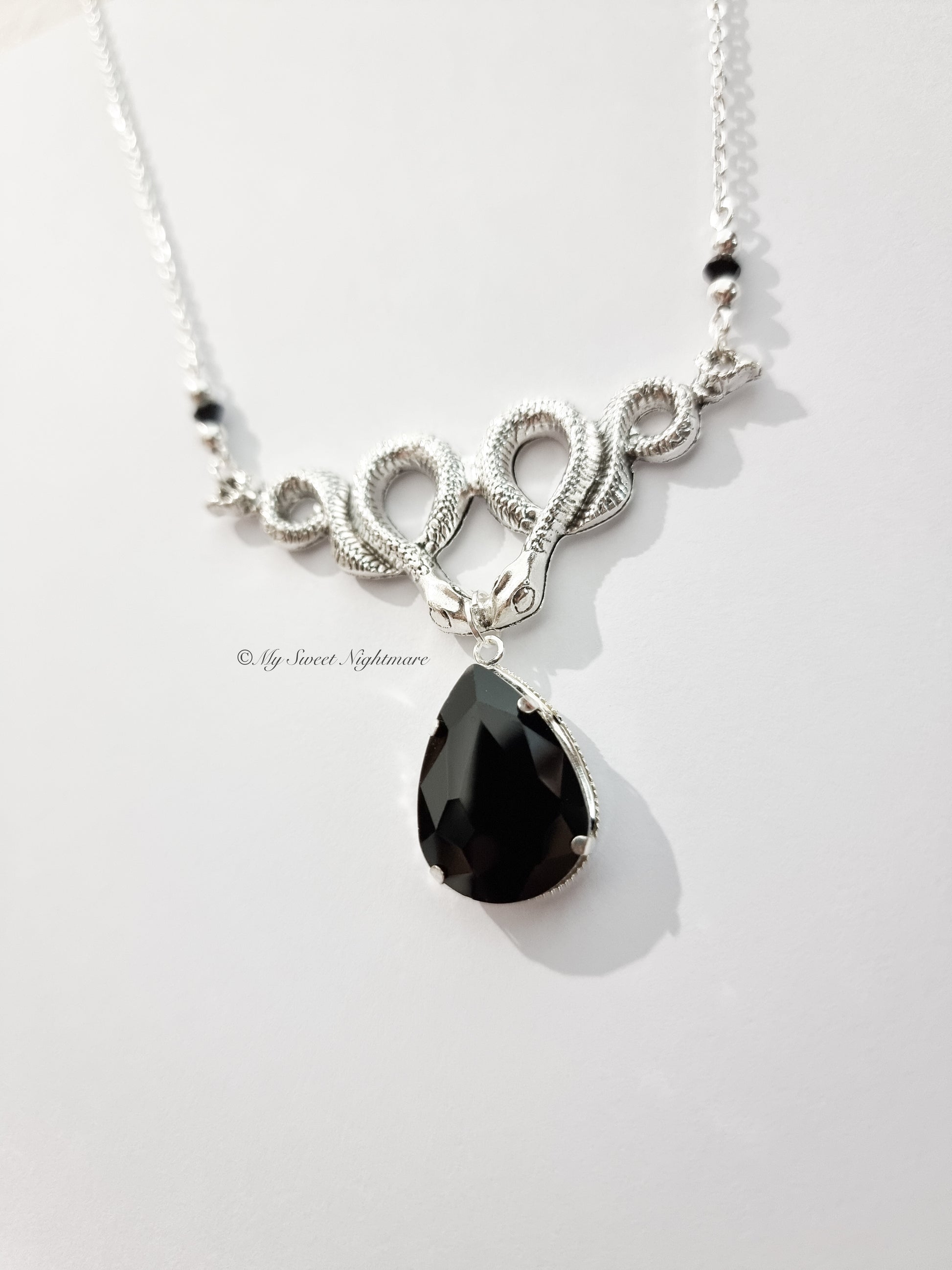 "MEDUSA" Gothic Necklace with Snakes and Black Drop Gem