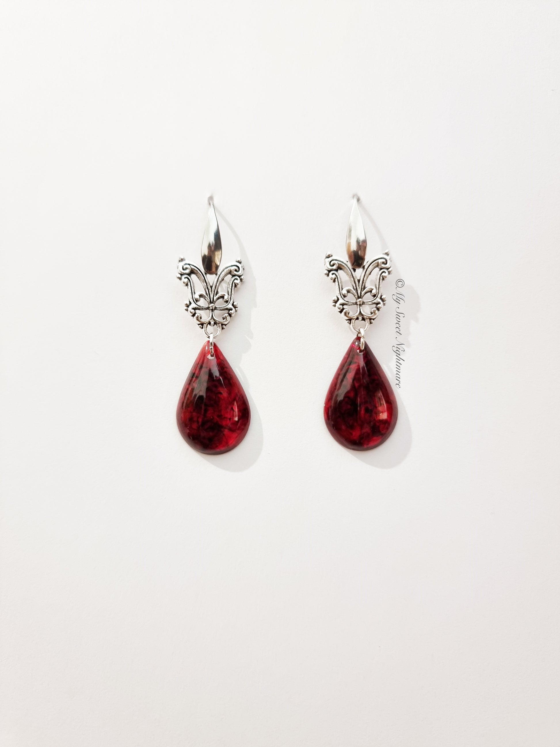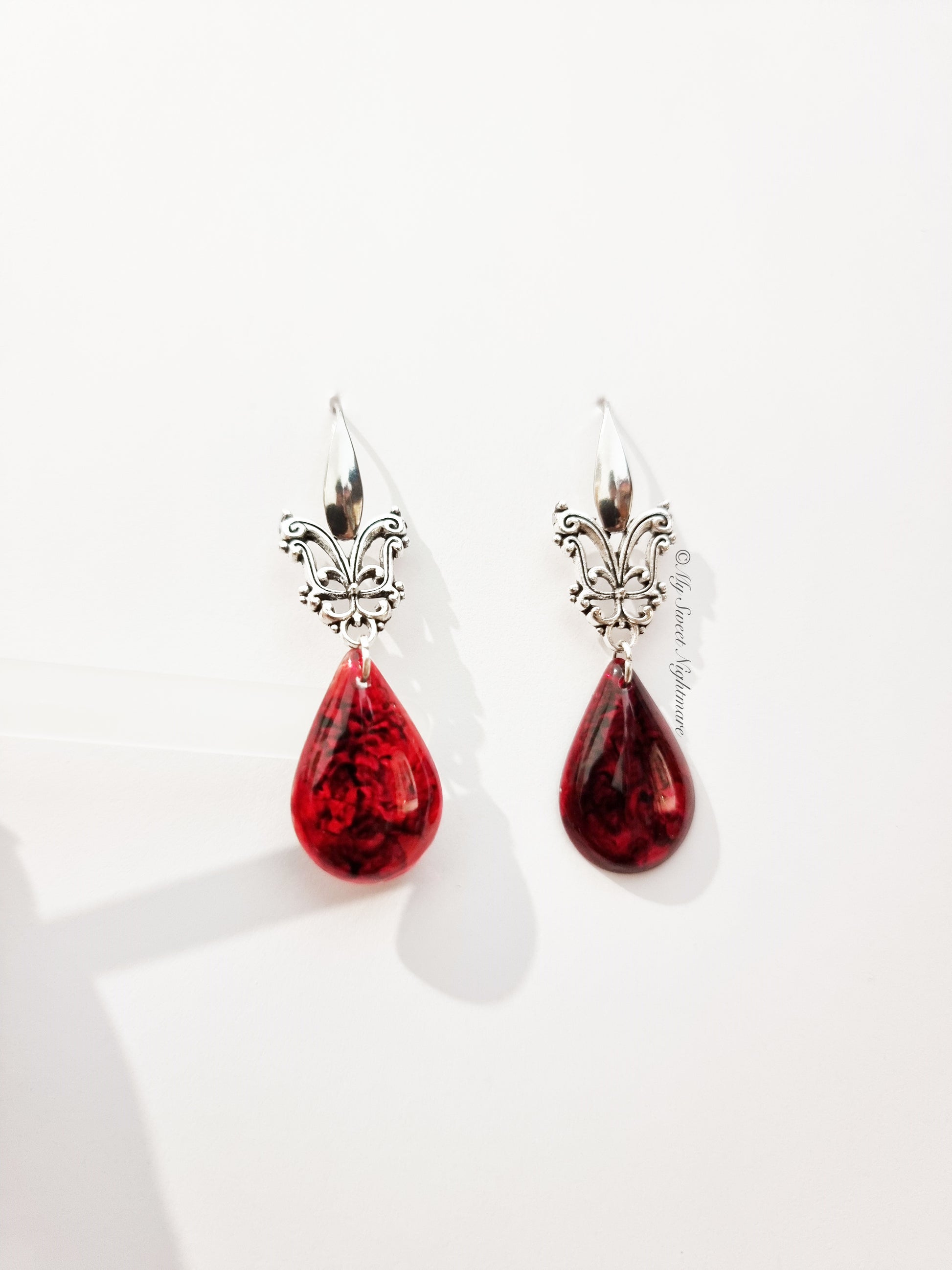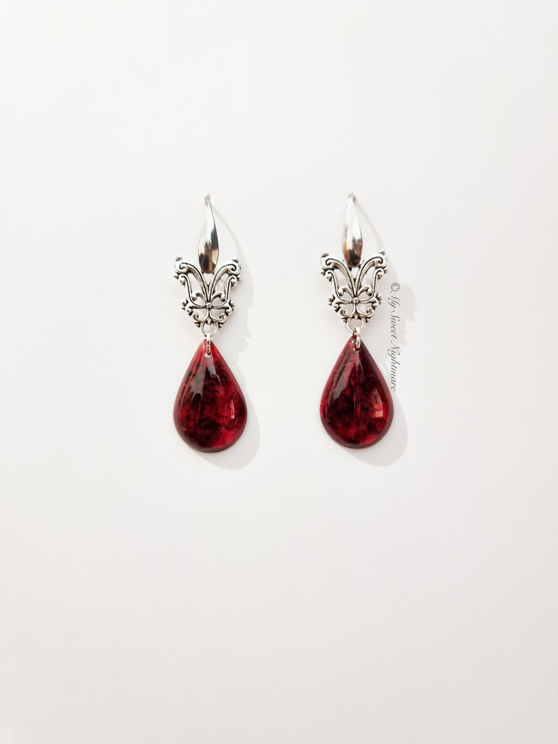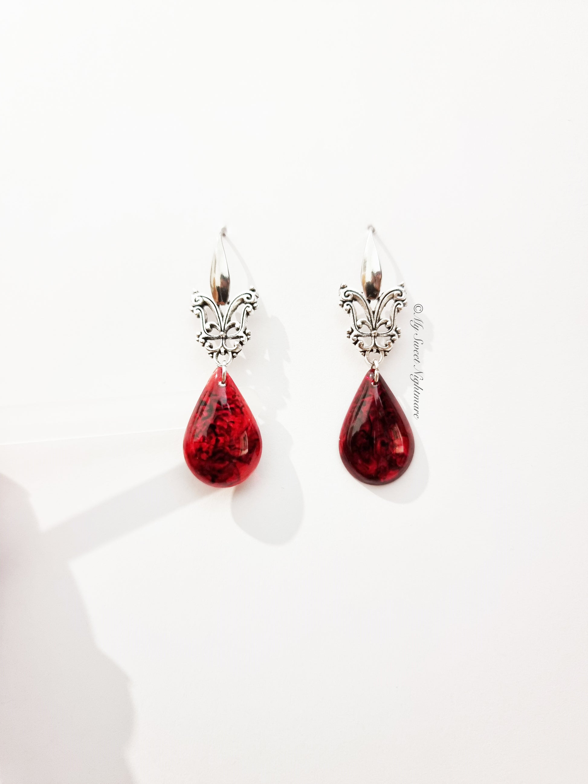 Il ciondolo a goccia di questi orecchini è interamente fatto a mano in resina, per la sua realizzazione e per creare questo effetto sangue molto realistico vengono impiegati circa di 2 giorni di lavoro compresa la lucidatura a mano, ma il suo effetto alla luce è davvero bello e particolare.