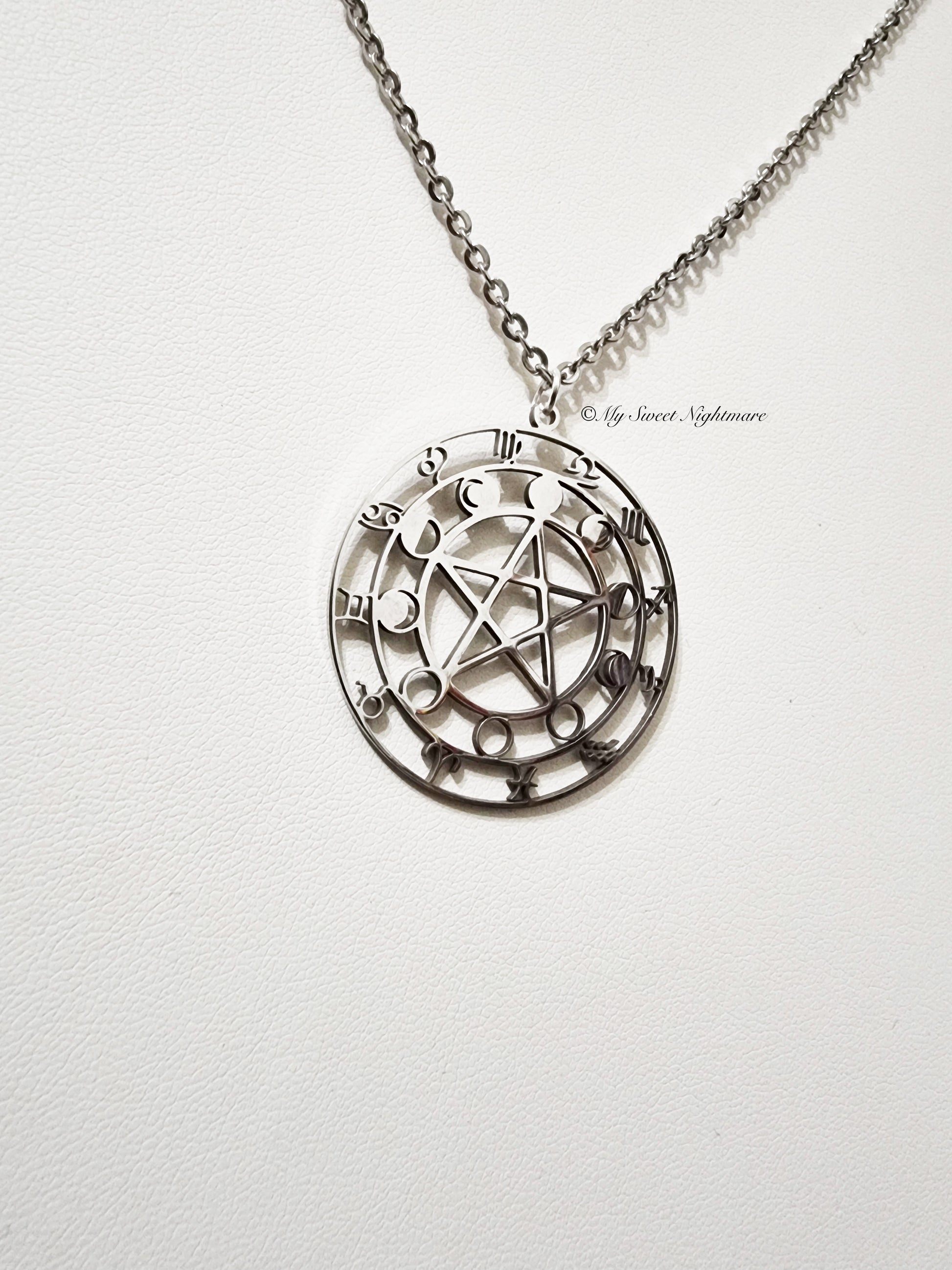 In questa collana è inciso un pentacolo circondato da fasi lunari e segni zodiacali, può considerarsi un vero e proprio amuleto protettivo.