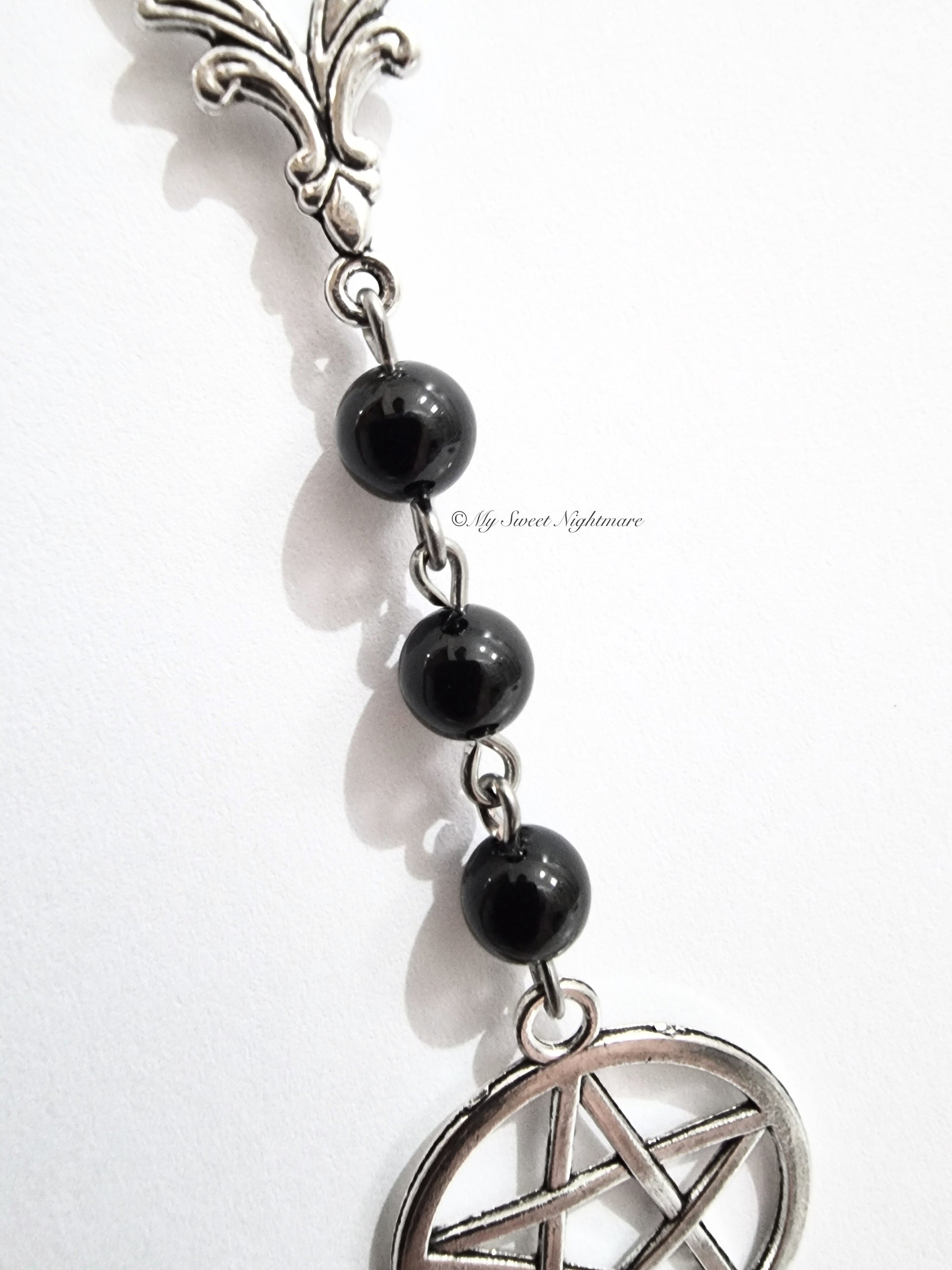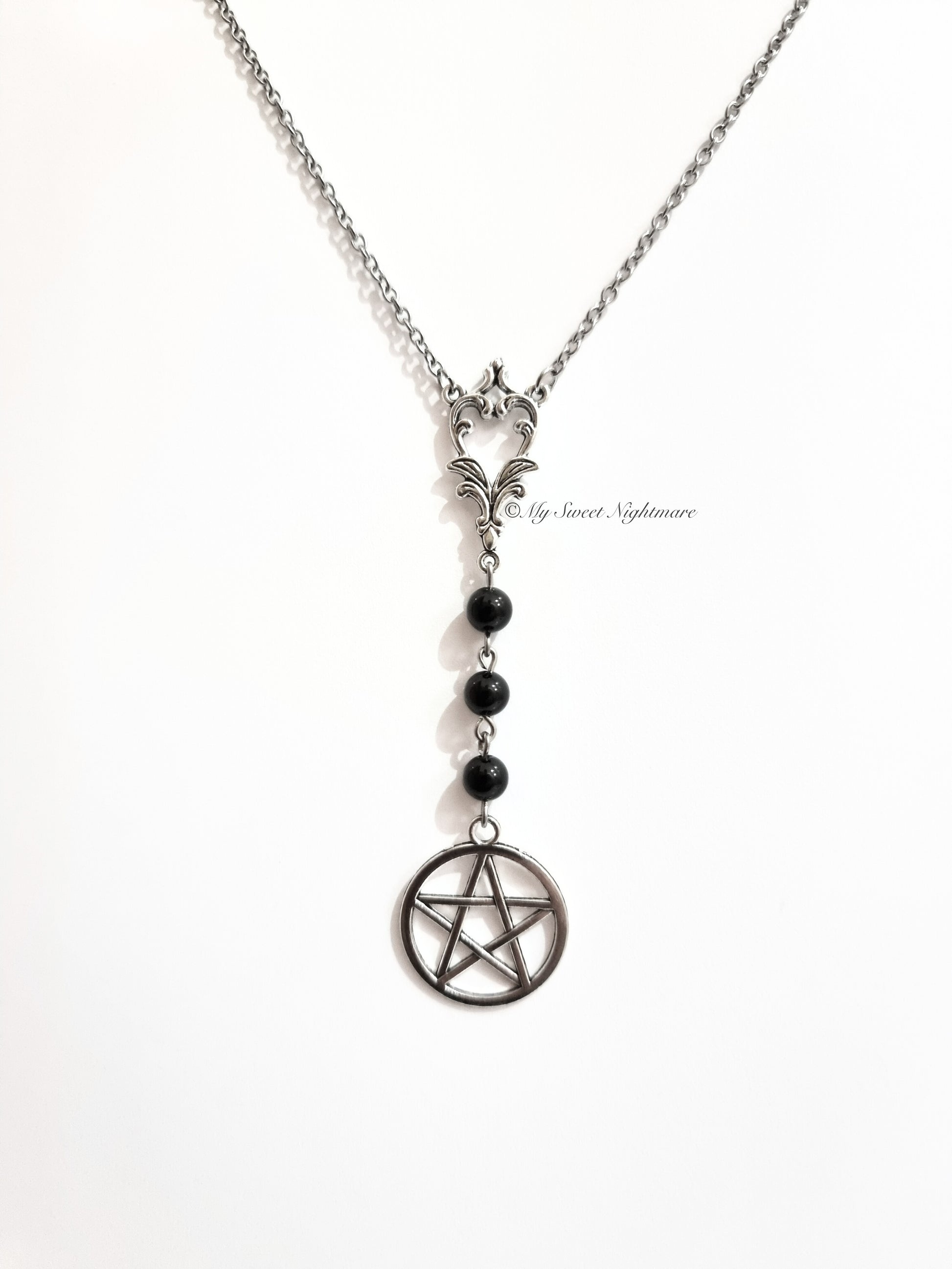 Questa collana con pentacolo e tre perle in tormalina nera naturale è ispirata allo stile dei rosari gotici e pagani, il ciondolo in metallo argentato rappresenta il pentacolo, simbolo di protezione e armonia, sospeso da pietre naturali scelte per la loro bellezza e il loro significato energetico.