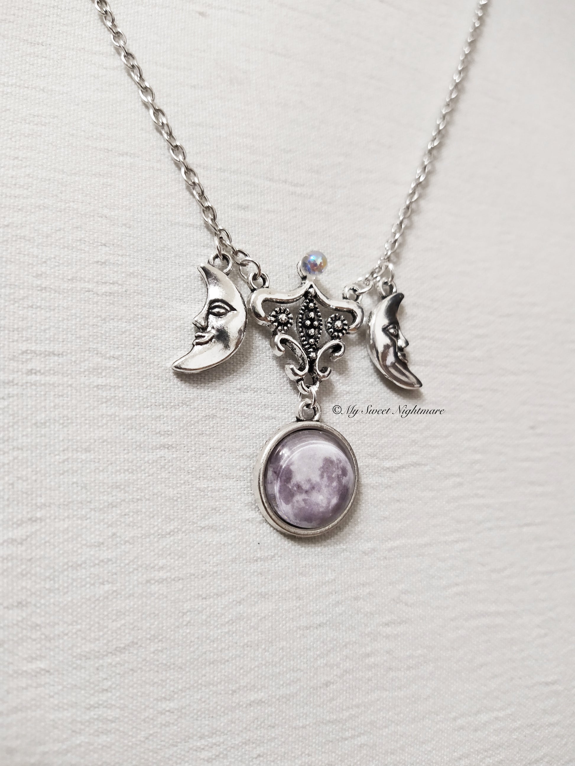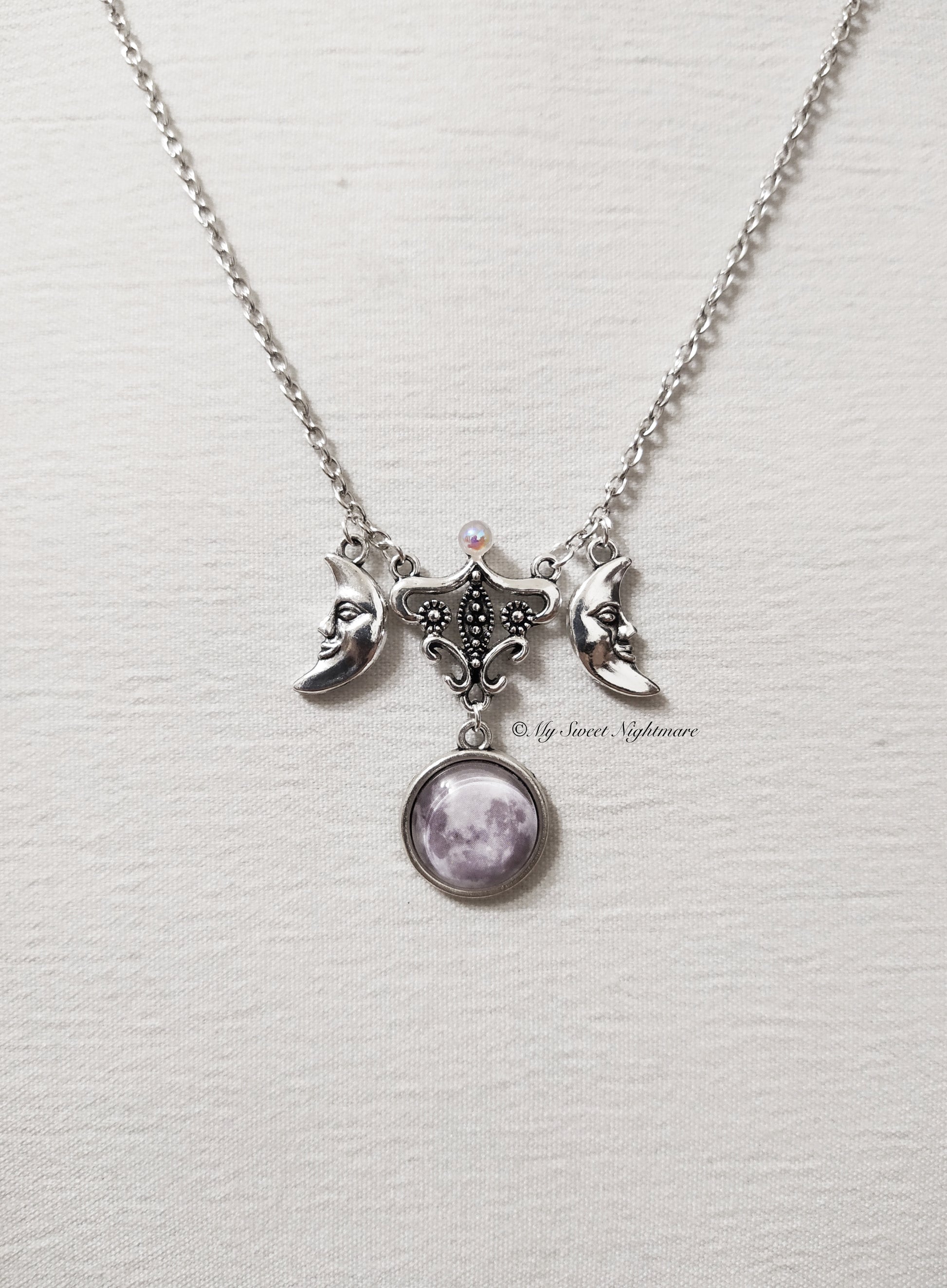 Questo gioiello simbologia la triplice luna e rappresenta le fasi di crescita femminile, la luna crescente a sinistra rappresenta la fanciulla, la luna piena al centro rappresenta la madre, la luna calante a destra rappresenta la donna anziana.