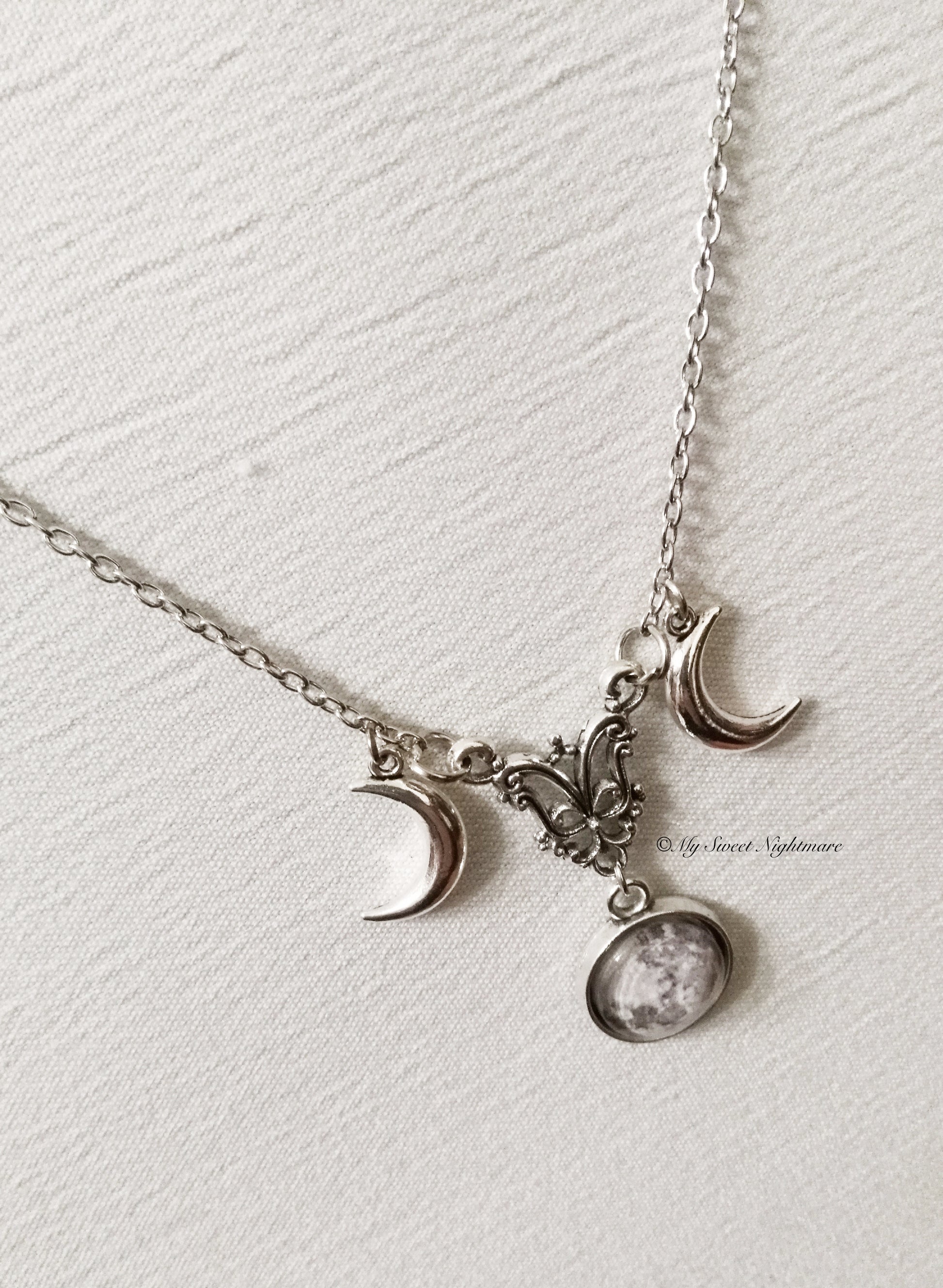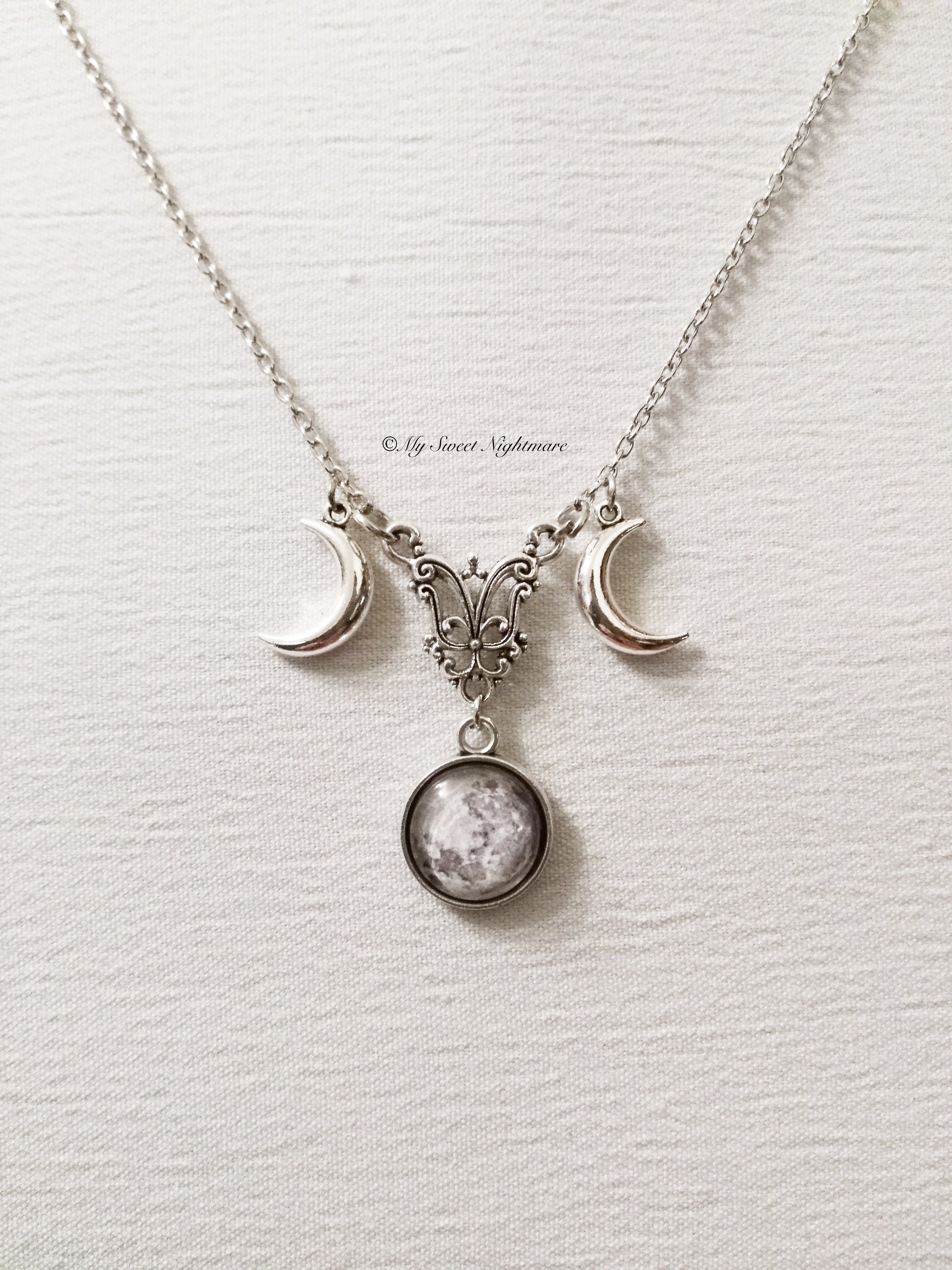 Questo gioiello simbologia la triplice luna e rappresenta le fasi di crescita femminile, la luna crescente a sinistra rappresenta la fanciulla, la luna piena al centro rappresenta la madre, la luna calante a destra rappresenta la donna anziana.