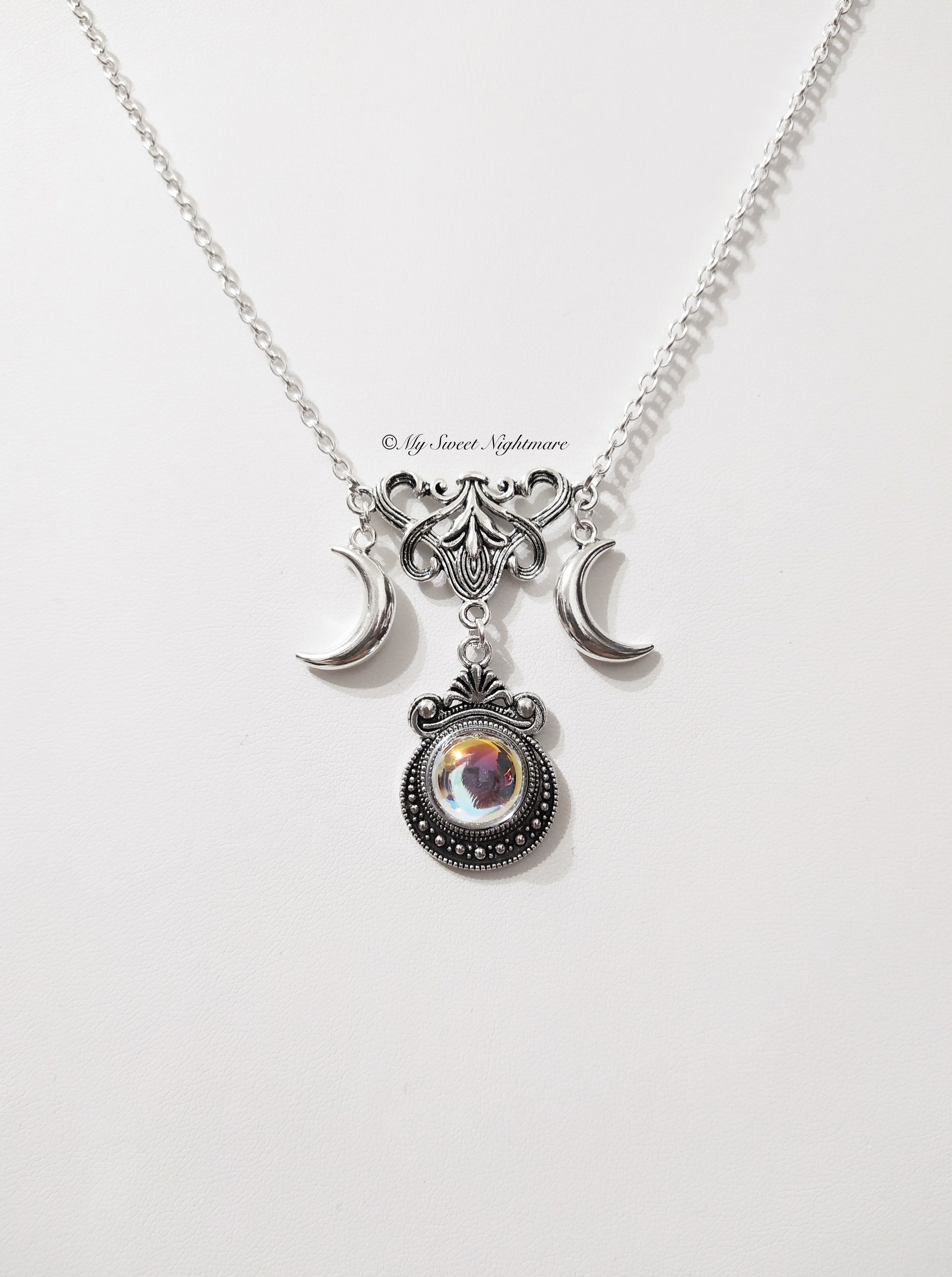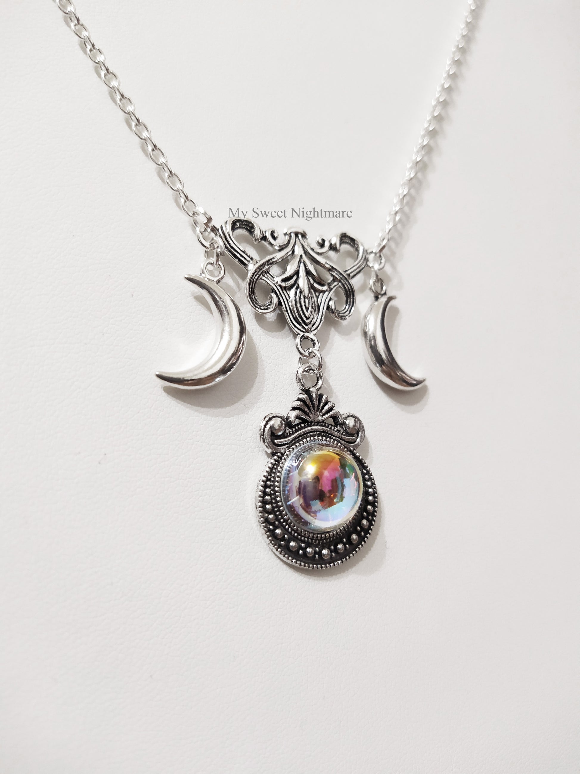 Questo gioiello simbologia la triplice luna e rappresenta le fasi di crescita femminile, la luna crescente a sinistra rappresenta la fanciulla, la luna piena al centro rappresenta la madre, la luna calante a destra rappresenta la donna anziana.