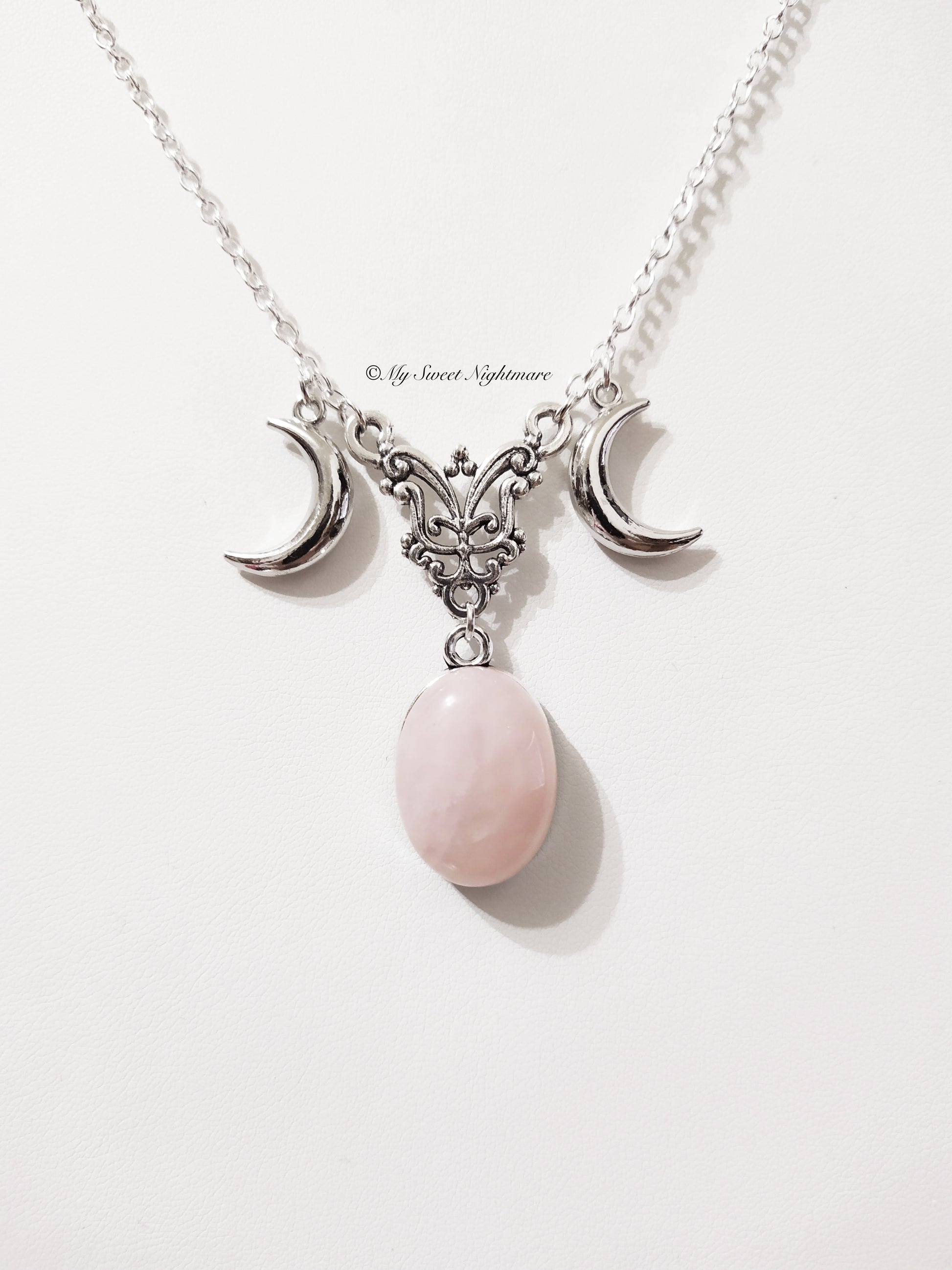 Il cabochon di questa triplice luna racchiude uno splendido quarzo rosa, questo gioiello combina le proprietà del quarzo rosa e la simbologia della triplice luna, che rappresenta le fasi di crescita femminile, la luna crescente a sinistra rappresenta la fanciulla, la luna piena al centro rappresenta la madre, la luna calante a destra rappresenta la donna anziana.