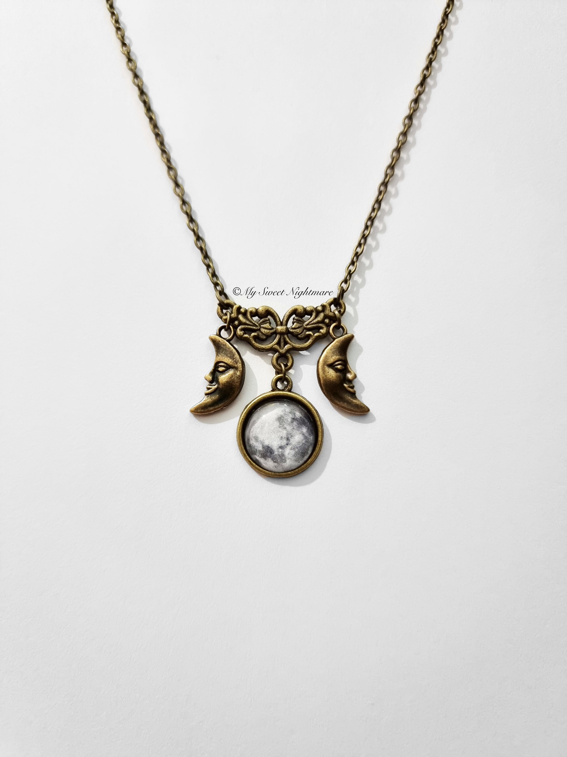 Questo gioiello simbologia la triplice luna e rappresenta le fasi di crescita femminile, la luna crescente a sinistra rappresenta la fanciulla, la luna piena al centro rappresenta la madre, la luna calante a destra rappresenta la donna anziana.