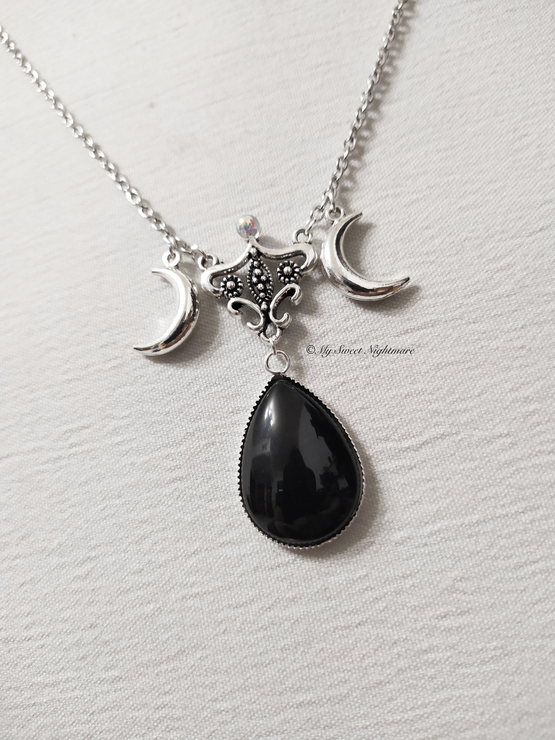 Collana gotica con triplice luna e pietra nera a goccia