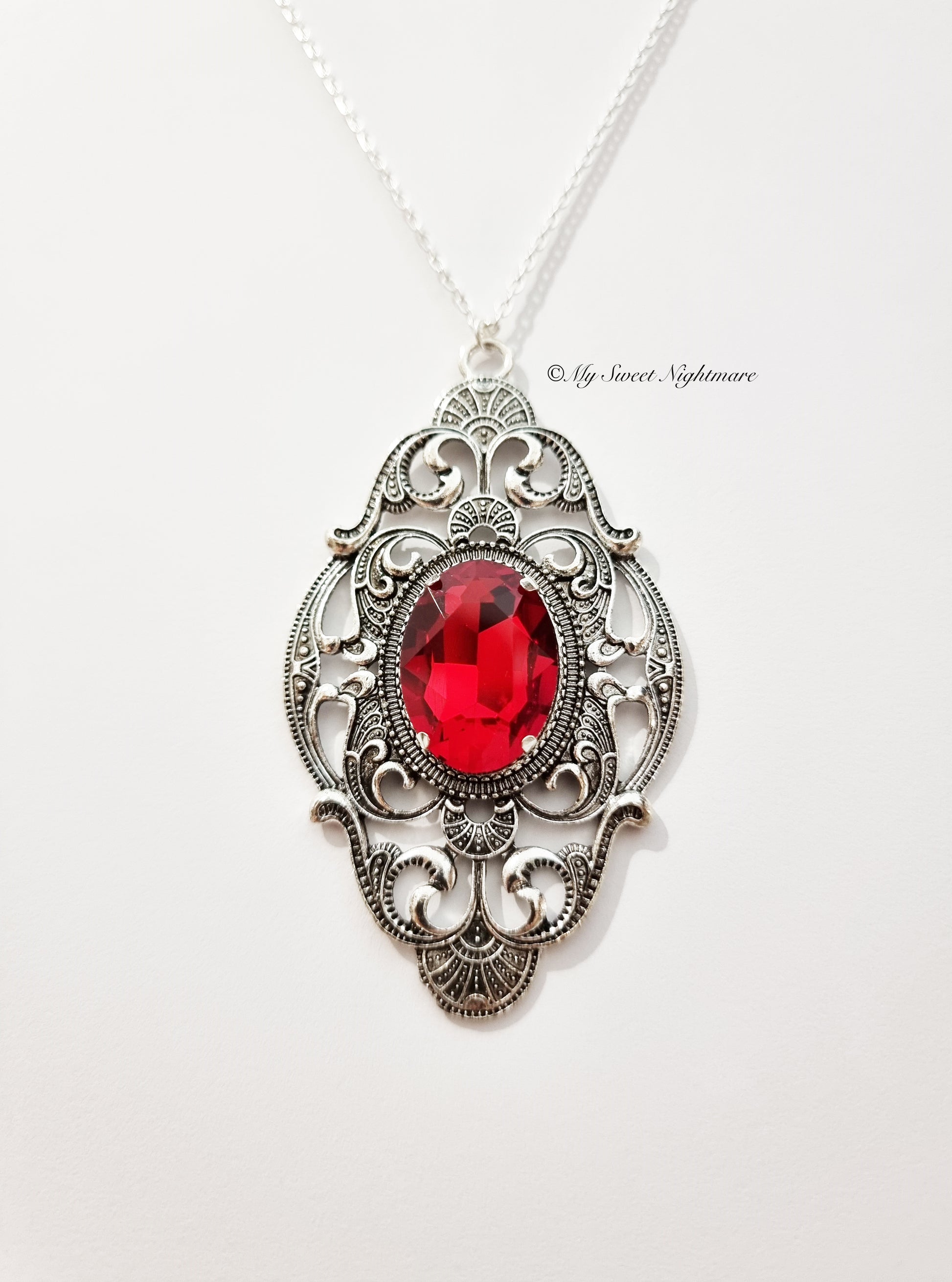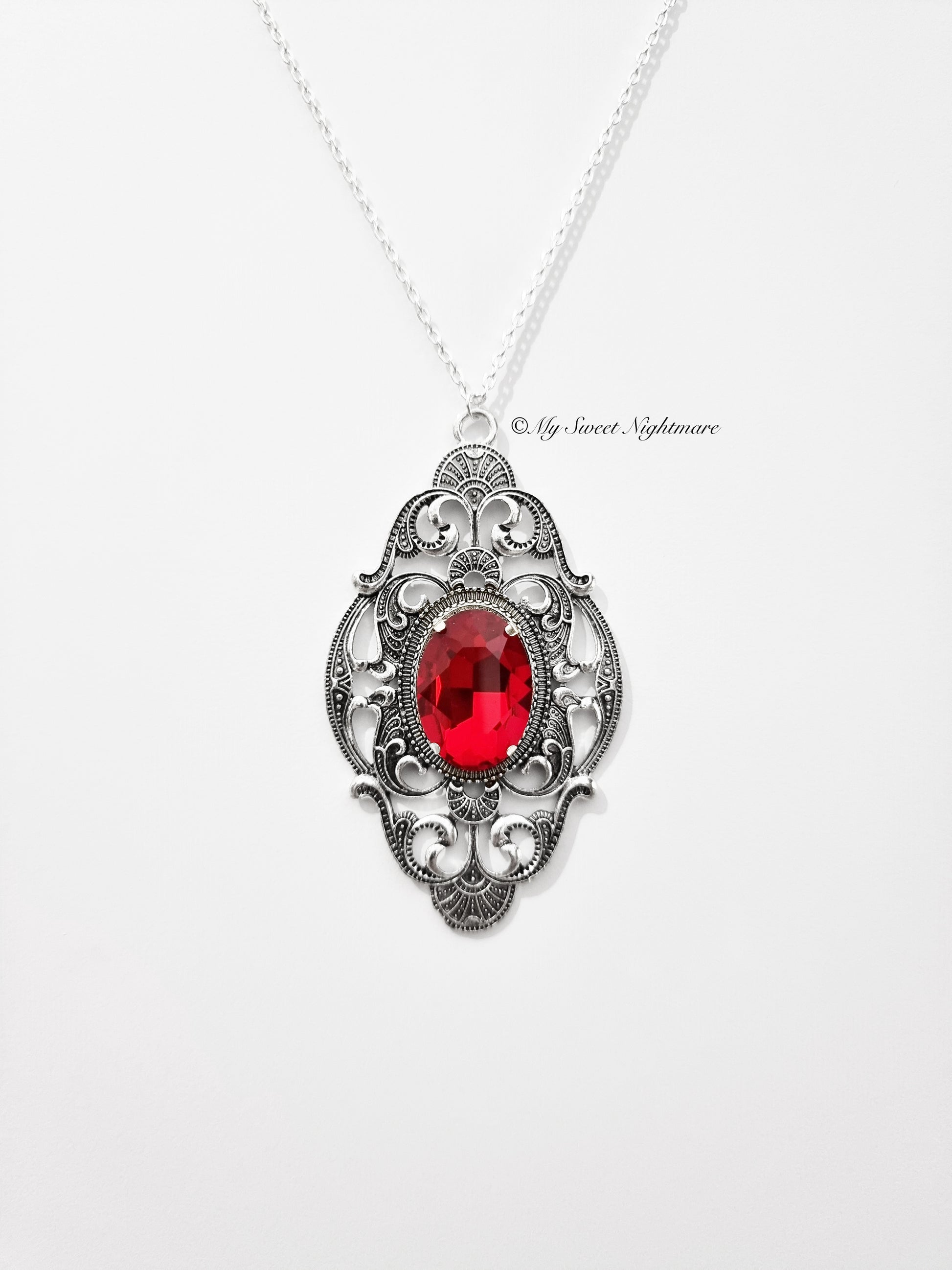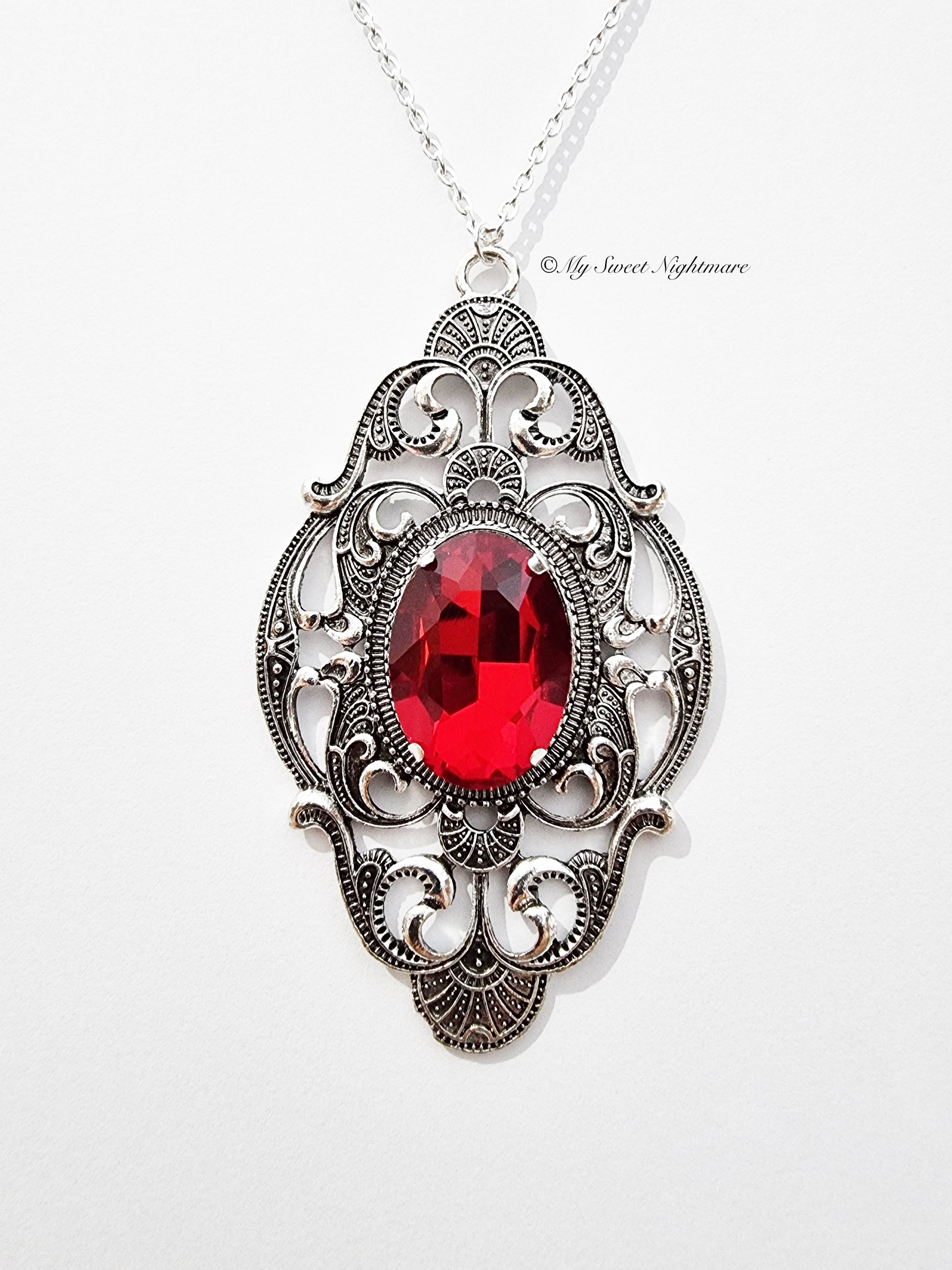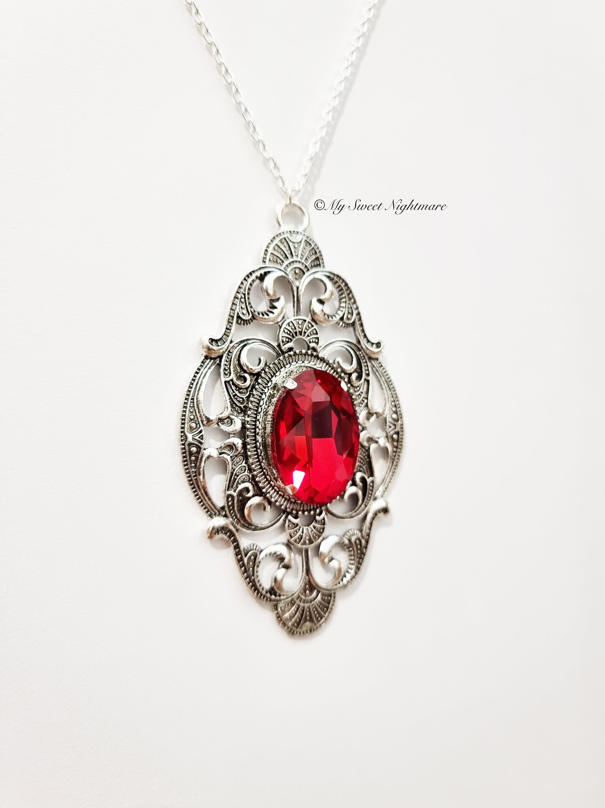 Medaglione vittoriano ornato con traforo in filigrana e gemma rosso sangue in vetro, una collana davvero molto elegante che non passa inosservata!