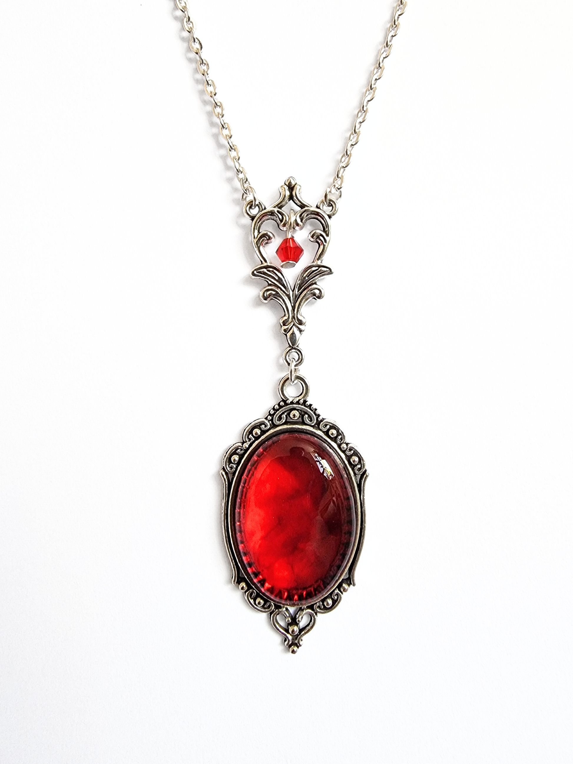 Il cabochon di questo ciondolo è interamente fatto a mano in resina, per la sua realizzazione e per creare questo effetto sangue molto realistico vengono impiegati circa di 2 giorni di lavoro compresa la lucidatura a mano, ma il suo effetto alla luce è davvero bello e particolare.