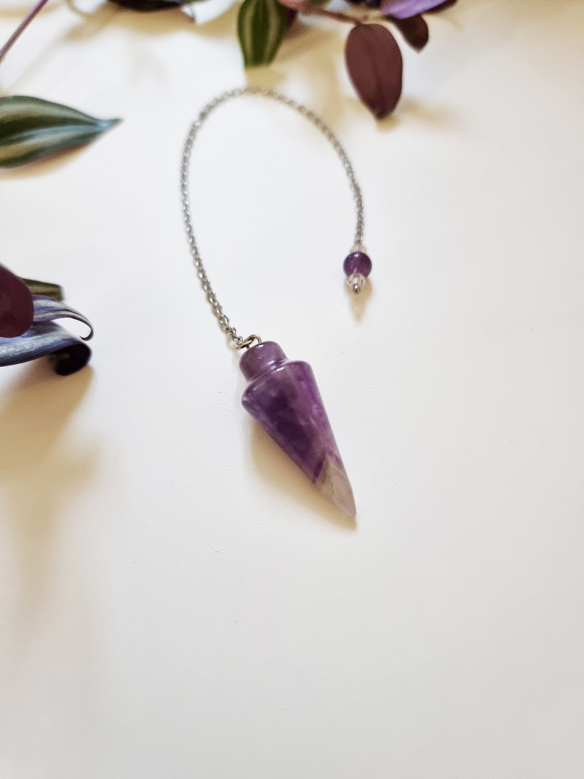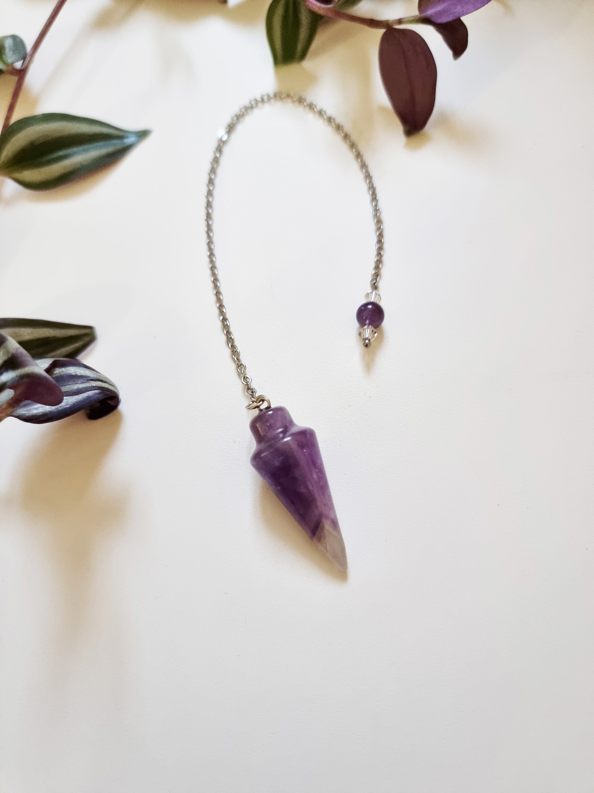 Pendolo divinatorio in ametista naturale impreziosito da cristalli trasparenti sfaccettati.