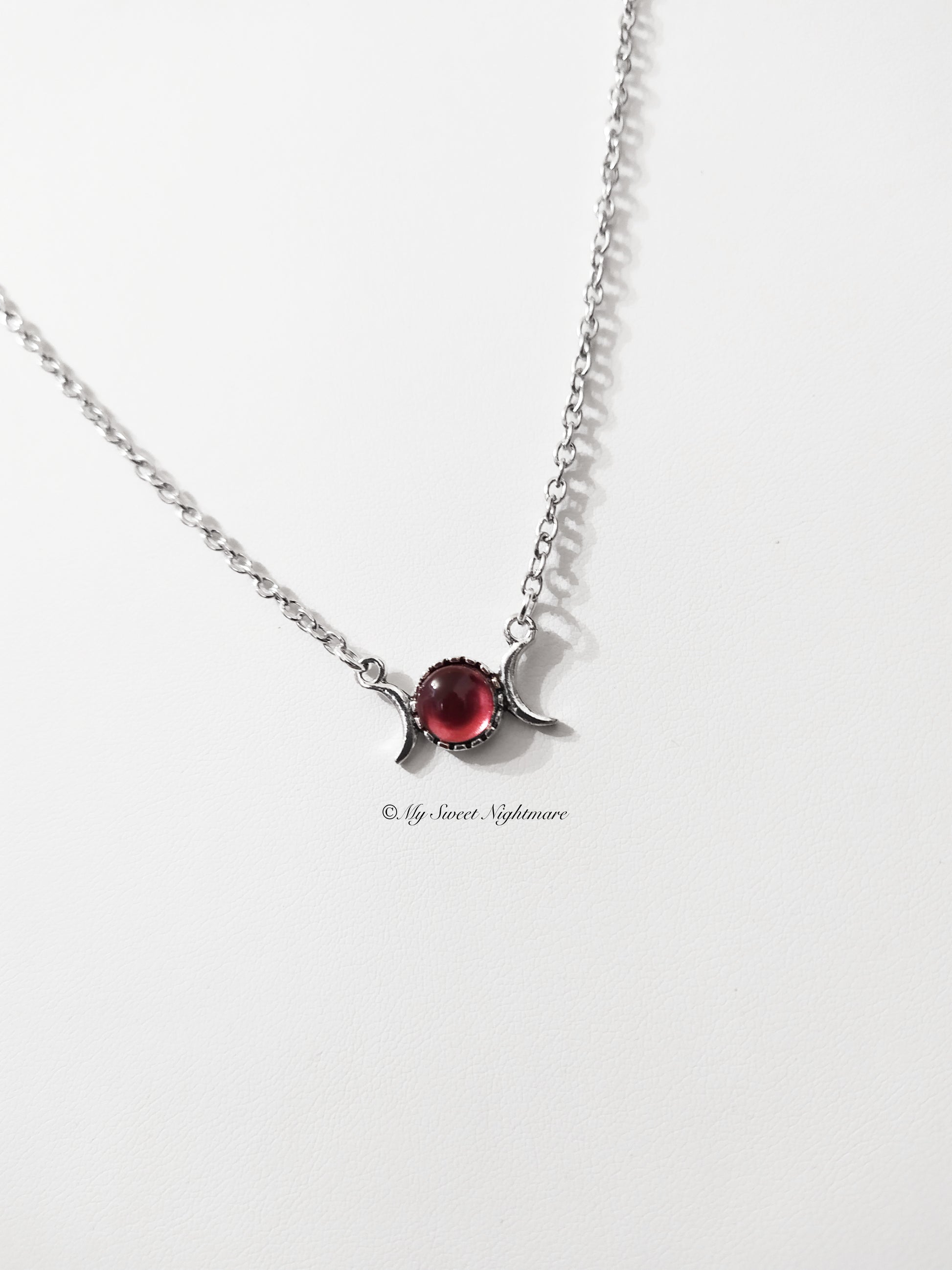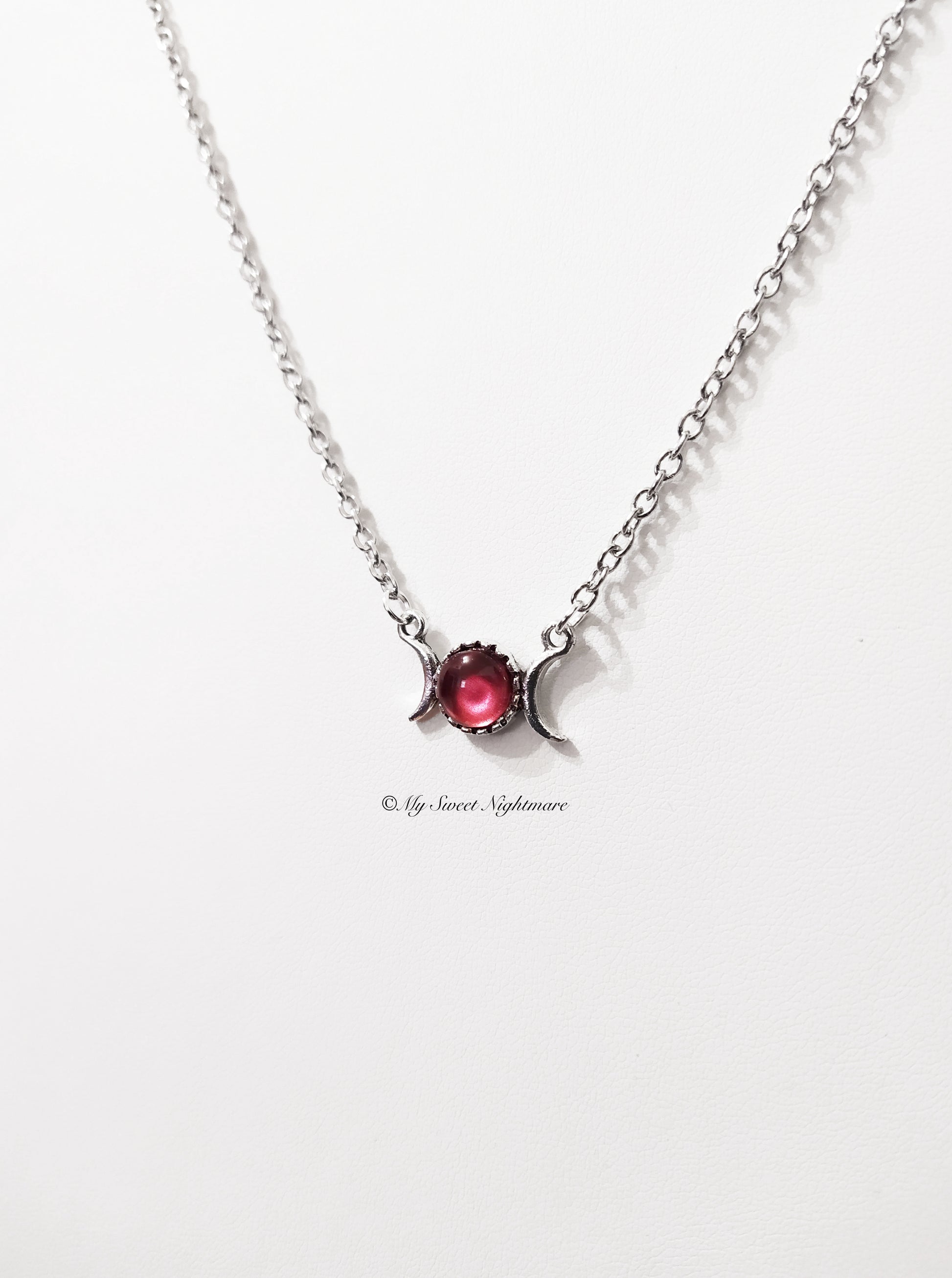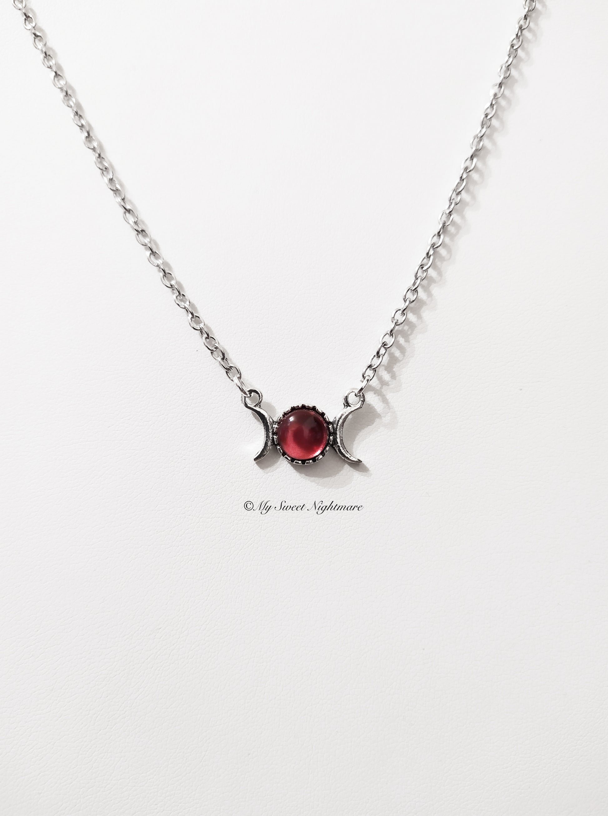 Il cabochon di questa piccola triplice luna è stato dipinto a mano di rosso, questo gioiello simbologia la triplice luna che rappresenta le fasi di crescita femminile, la luna crescente a sinistra rappresenta la fanciulla, la luna piena al centro rappresenta la madre, la luna calante a destra rappresenta la donna anziana.